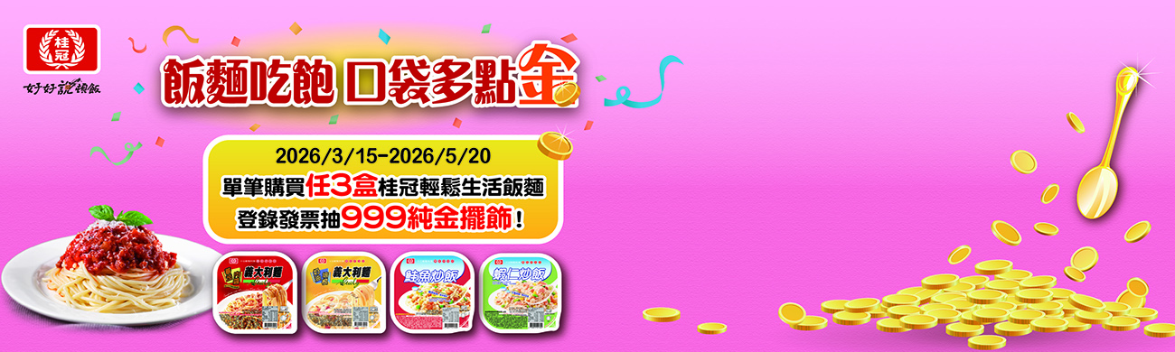 1.2026/03/15至 2026/05/20 單筆發票購買「桂冠輕鬆生活飯/麵品項任3盒」,凡桂冠線上購物商城會員,於 2026/05/27 前完成發票登錄即可參加抽獎。每張發票限登錄1次,1張發票為1次抽獎機會(同張發票若有重覆登入者,以首次登入所填載之資料為準)。此張發票上須載明所購買之桂冠產品品名且須包含指定品項,若得獎發票未載明產品資料,則須再出示此發票對應之載明桂冠指定系列商品品名之購物證明。