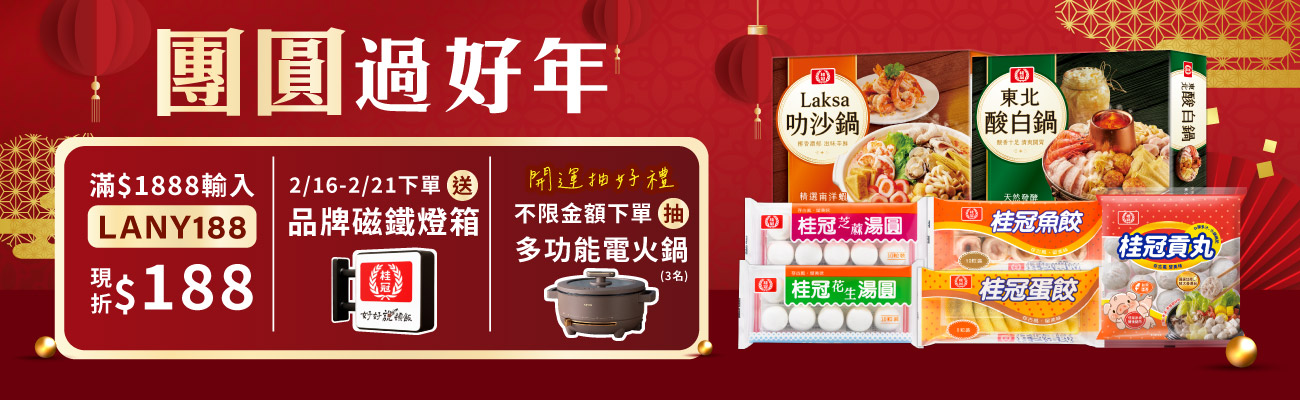 團圓賀新春! 用桂冠溫暖全家人的餐桌,輸入折扣碼訂單滿$1888現折$188,再抽多功能電火鍋