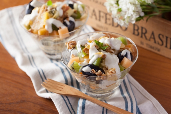 ②桂冠輕沙拉與檸檬汁調勻,淋在水果上即完成