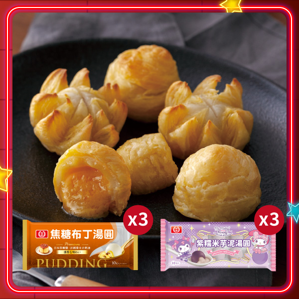 商品內容(固定組合):紫糯米芋泥湯圓*3+焦糖布丁湯圓*3