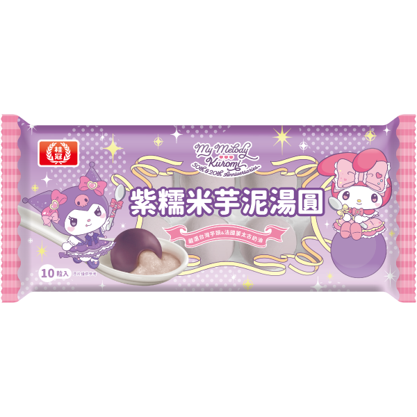 ✨桂冠紫糯米芋泥圓✨聯名三麗鷗爆紅明星嚴選100%台灣檳榔心芋製成內餡加入法國蒙太古奶油與日本島砂糖搭配以台灣契作的紫糯米Q彈外皮一口享受輕甜濃郁頂級芋泥美味~