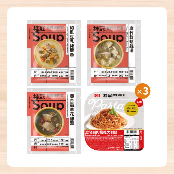 固定組合包含:和風豆乳豬腱湯1包腐竹鮮菇雞湯1包黃金蟲草花雞湯1包波隆那肉醬義大利麵3入