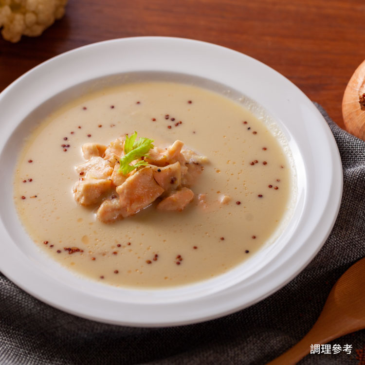 鮮奶與白花菜基底,混合著玉米香氣,搭配上鮭魚的鮮甜與紅藜麥的營養,交織出濃甜鮮香的完美風味!