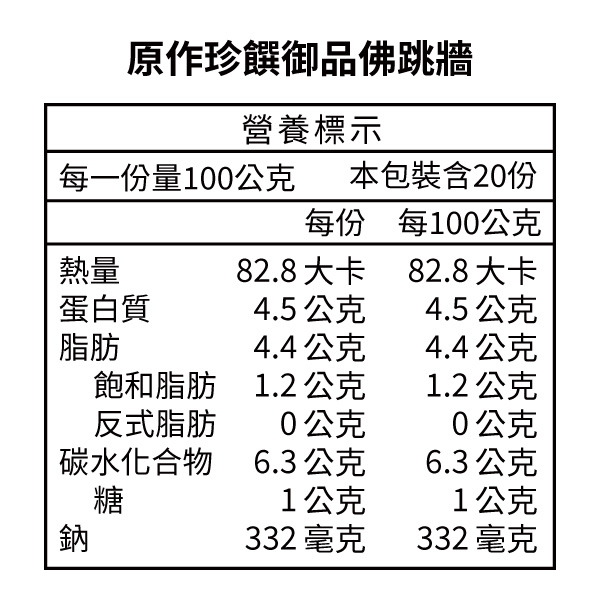 、酵母抽出物、玉米糖膠、黏稠劑(玉米糖膠、鹿角菜膠、氯化鉀、關華豆膠、糊精))、香菇、蒜頭、珠貝、糖、鹽、蝦米(蝦米、鹽)、調味劑(L-麩酸鈉、5'–次黃嘌呤核苷磷酸二鈉、