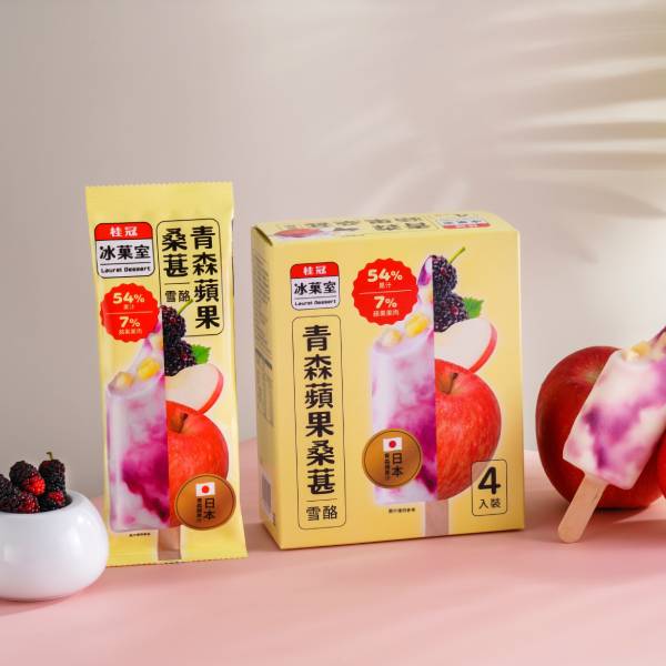 果力爆棚! 61%超高果汁含量,嚴選日本青森縣蘋果汁,帶來自然的甜香與飽滿果味,搭配一點桑葚的微酸清爽調味,讓風味更有層次。添加蘋果果肉,口感更豐富,每一口都能嚐到果實的真實感。清新的白色蘋果雪酪與桑葚夢幻紫色交織,好吃又有視覺享受。且不含牛奶成分,打造出桂冠冰菓室獨有的果味濃郁、口感清爽的水果雪酪。