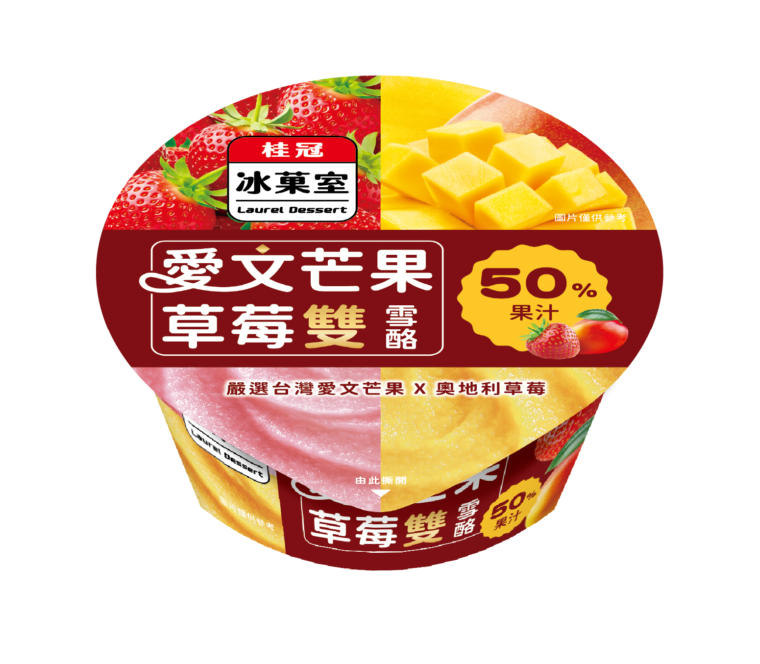 果汁含量50%!一半選用台灣愛文芒果製成的雪酪,香甜濃郁;另一半是酸甜奧地利草莓雪酪,超高果汁含量,一杯雙享!不含牛奶成分,每一口都能感受到果實的鮮美與自然香氣,雪酪質地細緻滑順, 讓每一口都充滿驚喜與幸福感!