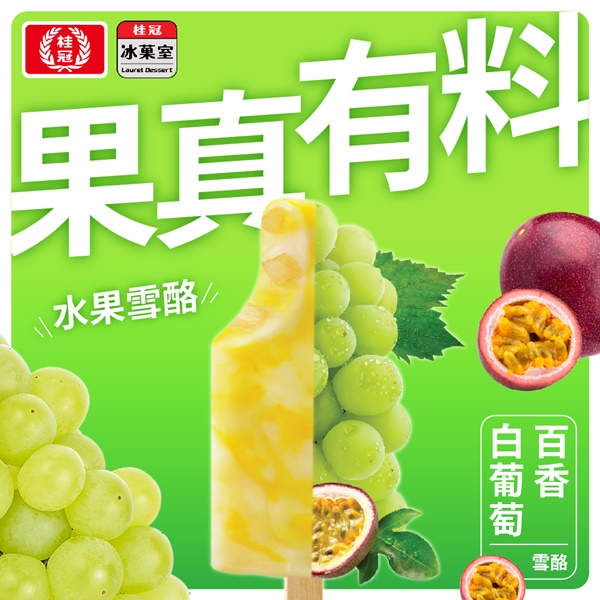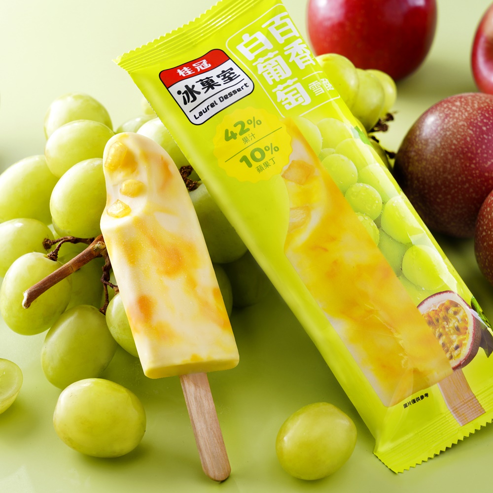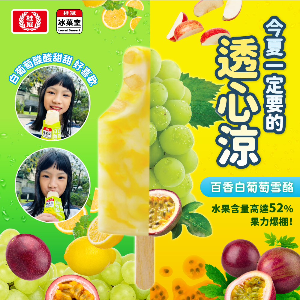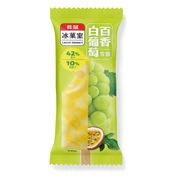 特選白葡萄果汁,搭配酸甜完熟的百香果汁,冰結成果汁含量42%、口感細緻綿密的水果雪酪,特別再加入10%甜爽口的蘋果果丁,一口就能精彩呈現出多層次的飽滿口感與豐富酸甜的水果風味。此外,雪酪外觀上以白葡萄與百香果的自然雙色,交織出多彩暈染的華麗紋路,一次滿足視覺與味覺的雙重消暑饗宴。