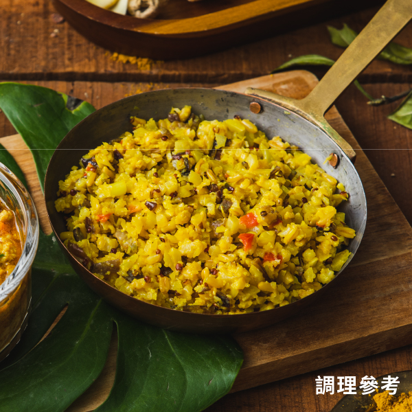使用燕麥、藜麥等食材,增加花椰菜米的嚼感,咖哩調味與甜椒的色彩點綴,完成色香味俱全又營養滿分的餐點。全素可食,單吃或取代白飯,滿足且無負擔。