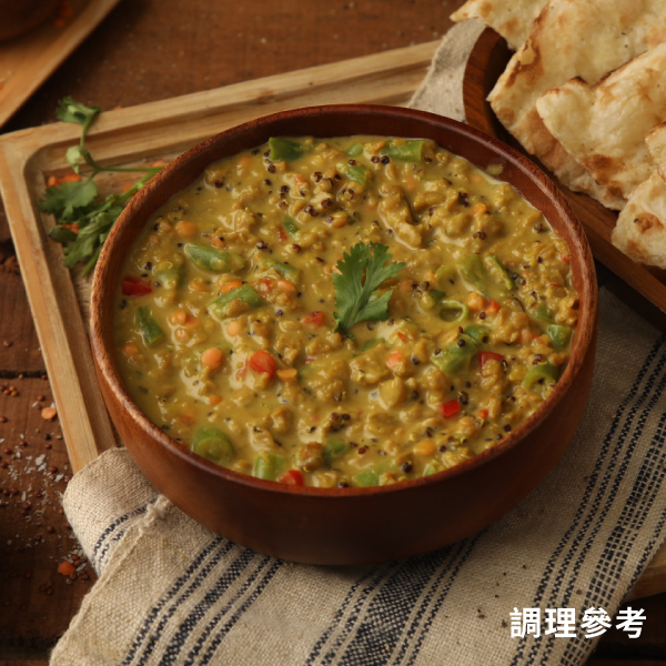 使用青刀豆、紅扁豆、藜麥等食材,與慢火炒香的咖哩調味,精心的火候控制與鬆軟的豆子口感,造就出香料層次豐富的印度風味咖哩,奶素者也能享用。