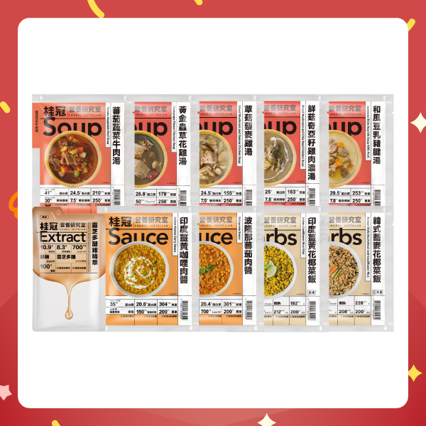 蕃茄蔬菜牛肉湯1包+黃金蟲草花雞湯1包+蕈菇藜麥雞湯1包+鮮菇奇亞籽雞肉濃湯1包+和風豆乳豬腱湯1包+印度薑黃咖哩肉醬1包+波隆那蕃茄肉醬1包+韓式蕎麥花椰菜飯1包+印度薑黃花椰菜飯1包+冷凍靈芝多醣雞精萃3包