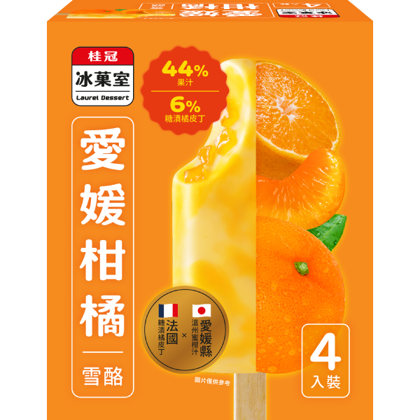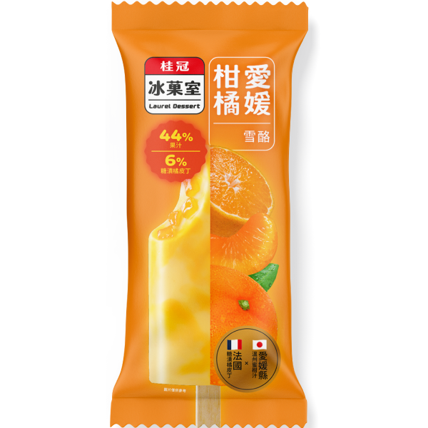 果力爆棚!高水果含量!特選來自日本愛媛縣溫州蜜柑汁,以及法國進口糖漬橘皮丁,多種柑橘風味疊加交織,口感更加有層次,且完全不含牛奶成分,打造出桂冠冰菓室獨有的果味濃郁、口感清爽的水果雪酪。