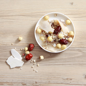 芡實、薏仁洗淨、瀝乾,加入500cc開水浸泡3小時。續加蓮子、淮山,放入電鍋內隔2杯水蒸煮熟。