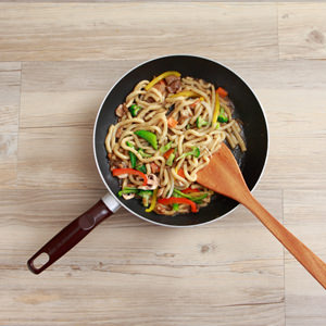 依照輕鬆料理五步驟「煮扣拌加好」,烹煮桂冠照燒豬肉炒烏龍麵。