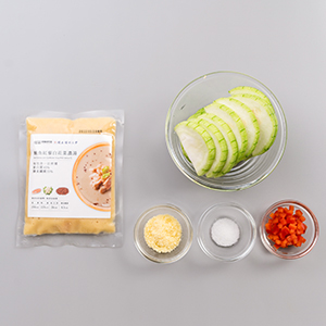 平底鍋中倒入鮭魚紅藜白花菜濃湯及絲瓜、紅椒丁並開小火煨煮,待絲瓜煮熟後即可盛盤。