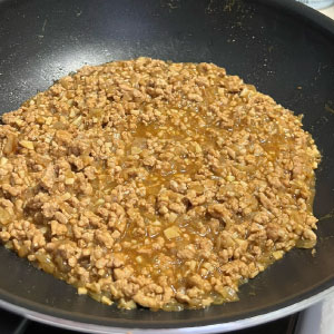 絞肉倒入,炒到肉末變白時,加入蒜末、咖哩粉