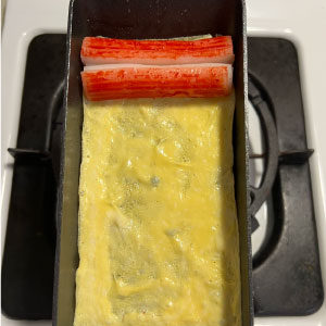 製作蟳味玉子燒,雞蛋加鹽1g、桂冠沙拉light 15g攪拌後過篩,蟳味棒過熱水燙一下起鍋備用,玉子燒鍋抹一層薄油,倒入蛋液,待半熟後頂端放入蟳味棒