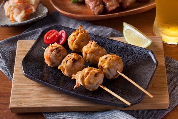 將貢丸與香菇貢丸中間切一個口將泡菜塞入。再將貢丸外層刷上烤肉醬火烤5-10分鐘直到表面醬汁收乾。最後再灑上少許黑芝麻、淋上少許檸檬汁。