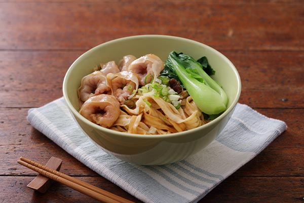 將水煮滾並放入麵條及魚餃一同煮熟,再放入青菜川燙至熟