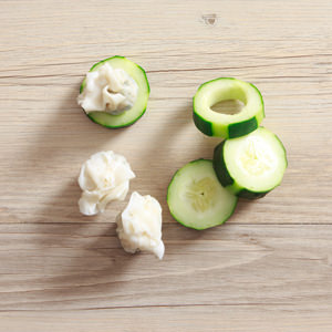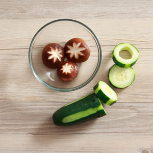 大黃瓜去皮,橫切成圓型、去籽,新鮮香菇以鹽稍醃。