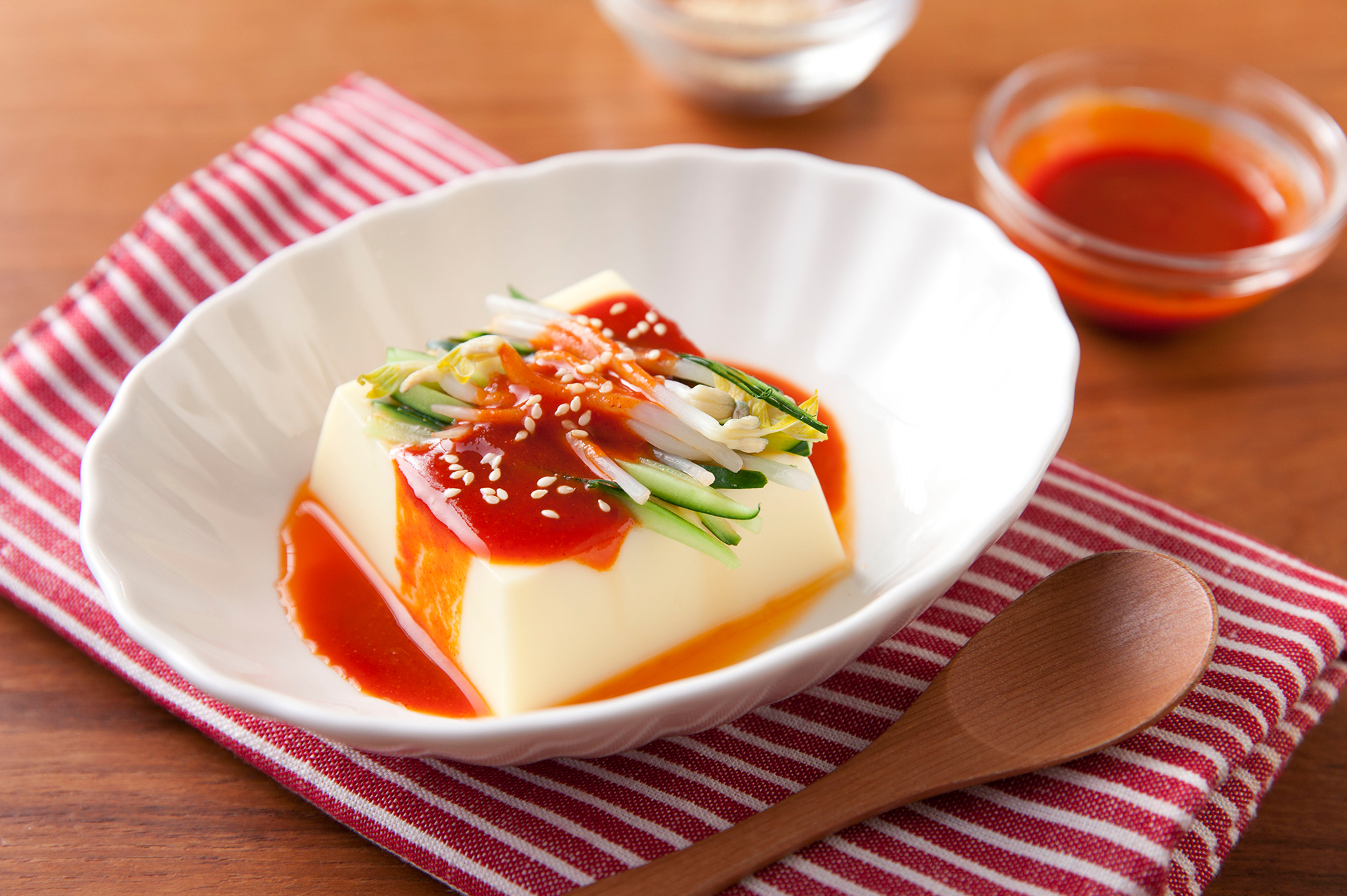 芙蓉豆腐放盤子上,依序放上豆芽菜、小黃瓜絲,淋上醬汁,再灑上白芝麻粒即完成