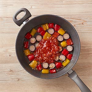 加入150ml的水後,加蓋小火燜煮5分鐘,開蓋後加入醬包再小火燜10分鐘即可。
