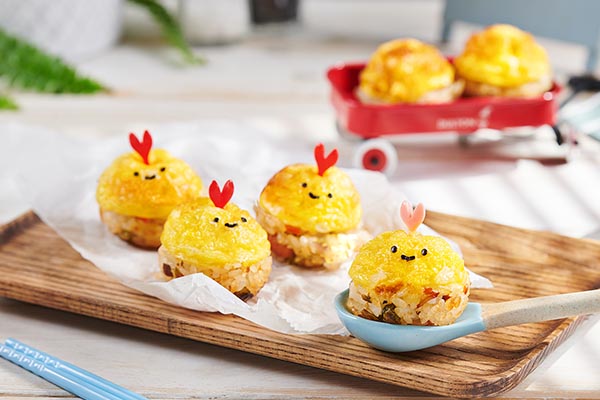 炒飯煎恰恰後與蛋相疊,四面翻煎形成一個球狀即可,盛盤後在利用海苔點綴眼睛嘴巴即完成。