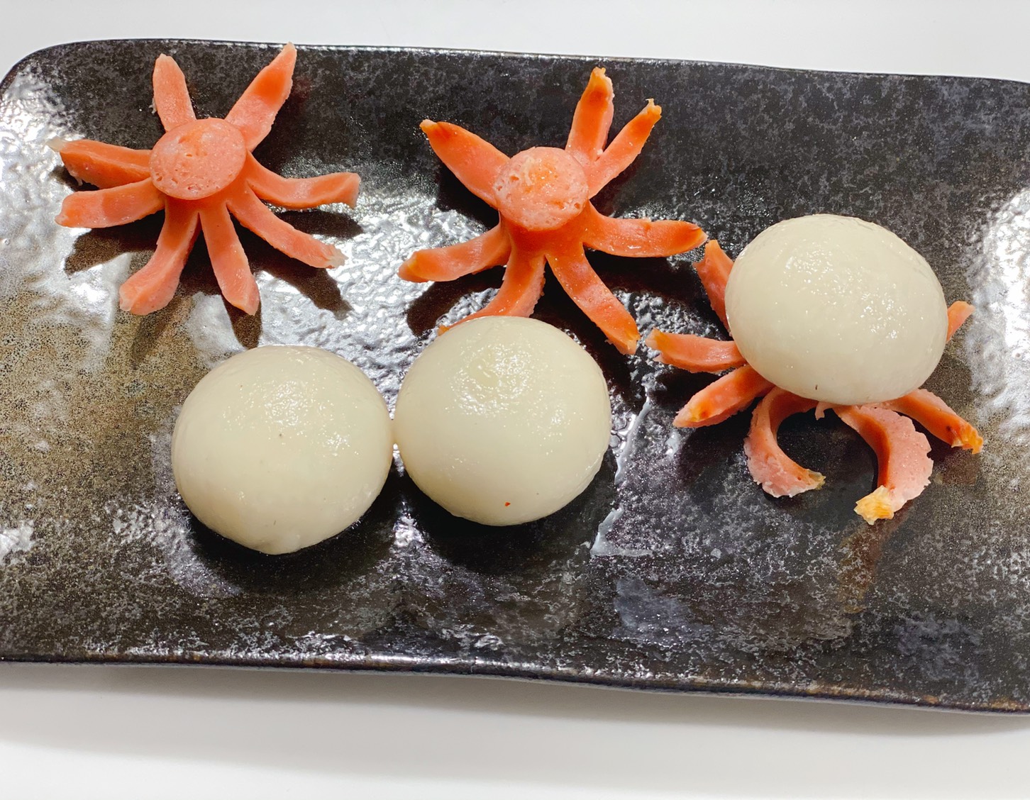 湯圓稍涼後即有粘性,直接放在小香腸上就變成一隻可愛的小章魚外型