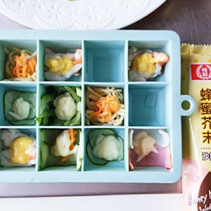 製作造型冰盒壽司: 矽膠製冰盒先整個過一下冷開水再開始鋪餡料。