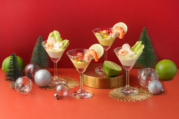 透明高腳杯中擠入蜂蜜芥末醬,放上蝦仁 酪梨後撒洋蔥末,最後點綴薄荷葉.另一杯放入蒜味凱薩沙拉醬,雞胸肉片及生菜即完成