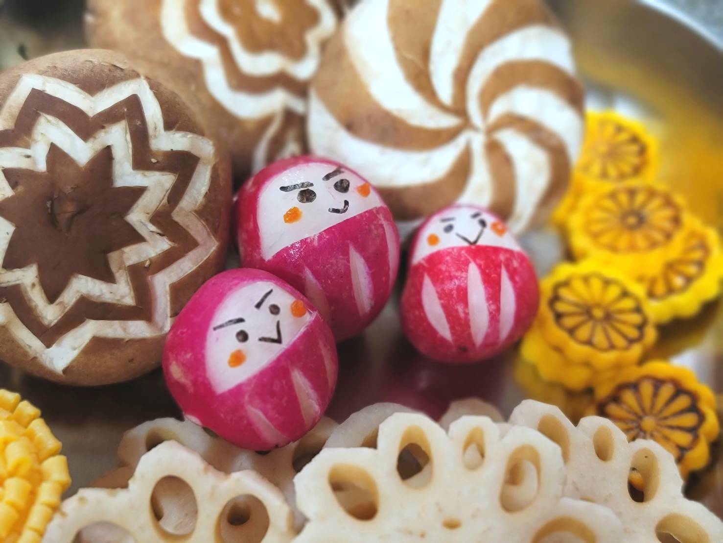 用食物雕刻刀將櫻桃蘿蔔劃出半月形,將紅色皮削除,再用水果刀在霸越形下方切出三個直條紋。