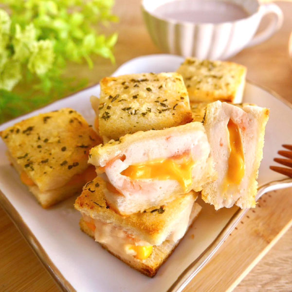 隨手可得的吐司,加入花枝蝦漿烤成酥脆吐司方塊,孩子的美味點心快速上桌!