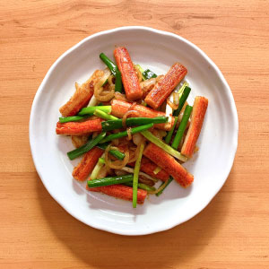 轉大火,放入蟳味棒拌勻,倒入調好的醬汁,放上蔥綠拌勻,即可完成。