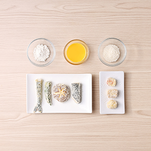 將天婦羅沾上低筋麵粉及蛋液,最後均勻裹上麵包粉。