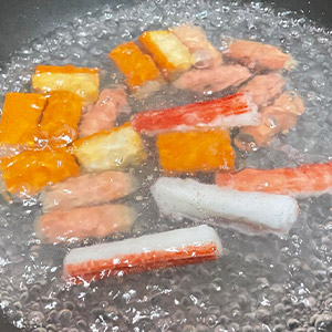 蟳味棒、德式起司腸、韓式起司包餡年糕滾水煮熟備用,蕎麥花椰菜飯依包裝說明微波或隔水加熱。備用