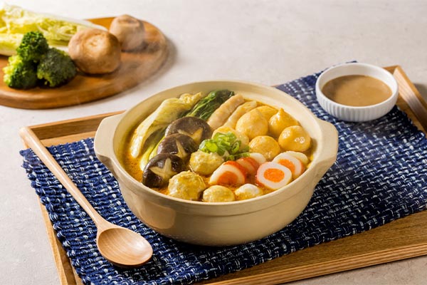 加入水與花椒粉,桂冠叻沙鍋拌勻後,加入所有火鍋料煮滾擺盤即可。